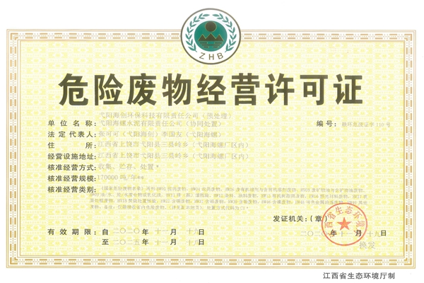 弋陽(yáng)海創(chuàng)順利取得正式《危險(xiǎn)廢物經(jīng)營(yíng)許可證》